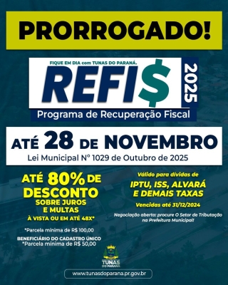 O Programa de Recuperação Fiscal (REFIS), foi prorrogado até o dia 28 de novembro de 2025, de acordo com a Lei Municipal n° 1029 de outubro de 2025.