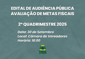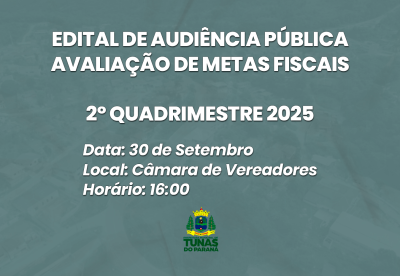 O MUNICÍPIO DE TUNAS DO PARANÁ, neste ato representado pelo Prefeito Municipal Sr. Marco Antônio Baldão, convida todos os munícipes para participarem da Audiência Pública de demonstração e avaliação das Metas Fiscais do Município de Tunas do Paraná, referente ao 2º Quadrimestre de 2025, conforme estabelece o artigo 9º, § 4º da Lei Complementar nº 101/2000-Lei de Responsabilidade Fiscal, que acontecerá no dia 30 de SETEMBRO de 2025, às 16h00min, nas dependências da Câmara Municipal de Vereadores de Tunas do Paraná.